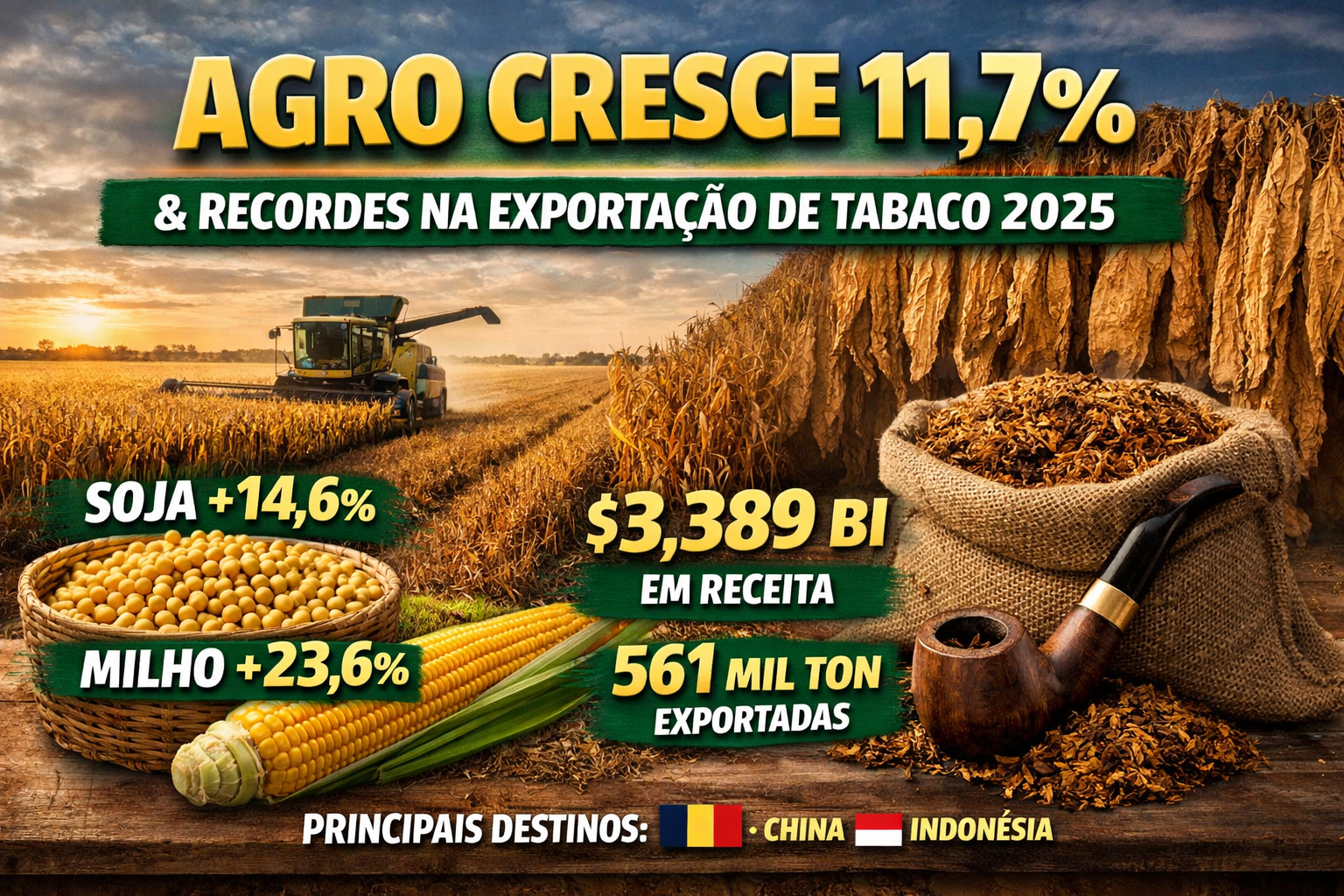 Agro cresce 11,7% e exportações de tabaco batem recorde histórico em 2025