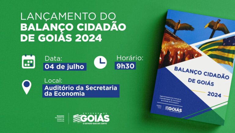 A Secretaria da Economia realiza nesta sexta-feira (4/7), às 9h30, o lançamento do Balanço Cidadão de Goiás 2024, acompanhado de coletiva de imprensa. O relatório apresenta, de forma simplificada, dados sobre a arrecadação, os investimentos e as principais ações do Governo de Goiás no ano passado.