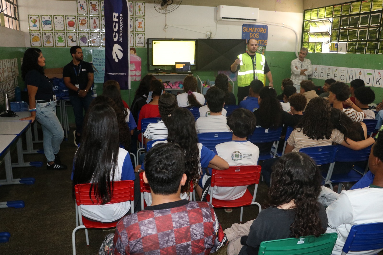 Cerca de 500 estudantes do Ensino Fundamental (6º ao 9º ano) da Escola Municipal Pedro Costa de Medeiros participaram, na manhã desta sexta-feira (4/4), de uma palestra educativa com a equipe de segurança operacional da CCR Aeroportos, empresa que administra o Aeroporto Internacional de Goiânia – Santa Genoveva.