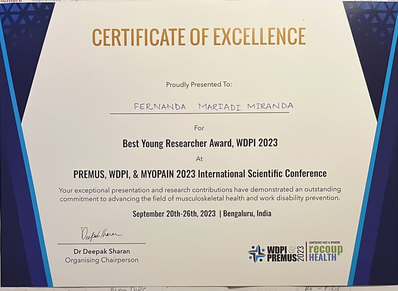 A pesquisadora Fernanda Maria de Miranda, doutoranda do Programa de Pós-Graduação em Enfermagem da Universidade Federal de São Carlos (UFSCar), foi premiada em evento internacional de grande alcance e qualidade na área da saúde do trabalhador – The 11th International Scientific Conference on Prevention of Work-related Musculoskeletal Disorders (PREMUS); 6th Work, Disability, Prevention and Integration (WDPI); and 11th Myofascial Pain Syndrome and Fibromyalgia Syndrome (MYOPAIN) -, realizado recentemente na Índia.
