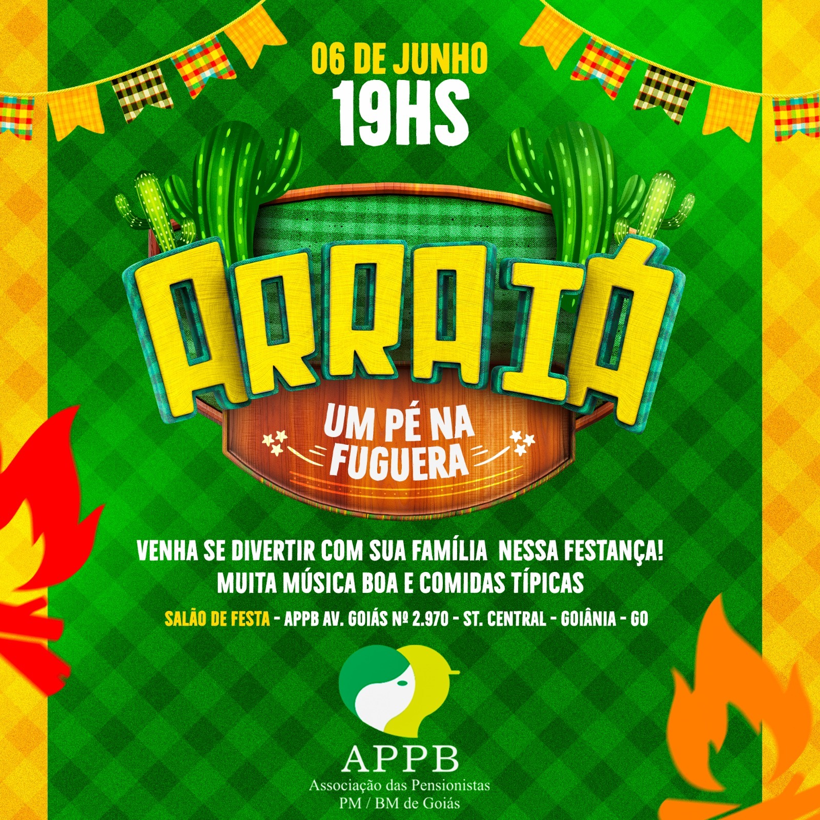 A Associação das Pensionistas da PM/BM de Goiás (APPB), presidida pela Sra. Divina Roberta, com apoio da vice-presidente, Sra. Valdeci Custódia, convida toda a comunidade para o Arraiá “Um Pé na Fuguera”, que será realizado no dia 6 de junho, a partir das 19h, na sede administrativa da entidade, em Goiânia com entrada gratuita.