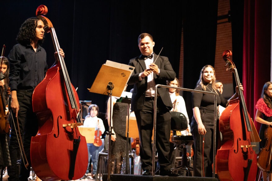 Jovens músicos das orquestras Infantil Mozart e Sinfônica Pedro Ludovico Teixeira sobem ao palco neste domingo, sob regência dos maestros Tiago Biscaro, Andreyw Batista e Erick Félix