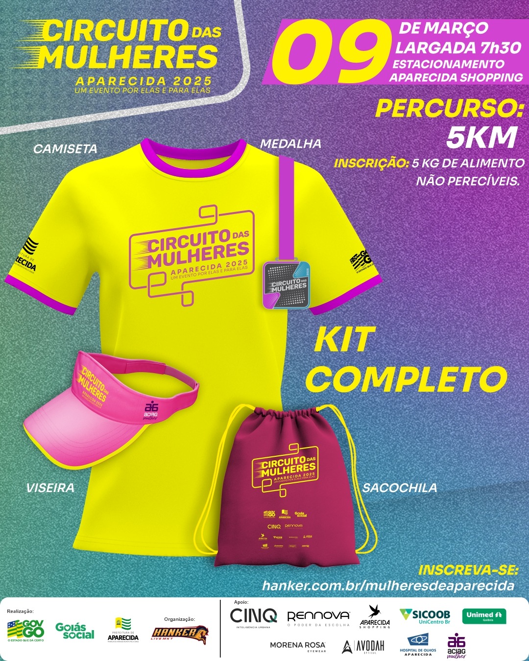 O evento também conta com patrocínio do Aparecida Shopping, Hanker Live, Rennova, Cinq Construtora, Banco Sicoob, Morena Rosa, Unimed, Avodah Optical, Hospital de Olhos de Aparecida e Aciag Mulher. “Graças ao apoio da iniciativa privada estamos conseguindo realizar este evento em homenagem às mulheres de Aparecida. O circuito também tem objetivo social que é o de arrecadar alimentos e promover o bem-estar feminino”, pontuou o prefeito Leandro Vilela.