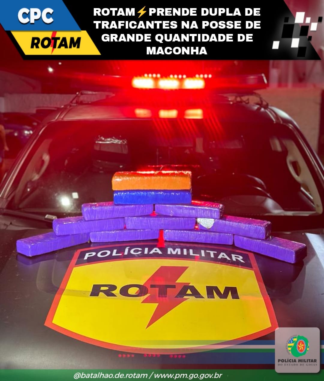 Por meio de informações a Rotam foi até um  ponto de venda de entorpecentes no Setor Napolis em Cidade Ocidental-Go.  Durante patrulhamento direcionado, Equipe aborda usuário na porta de um condomínio residencial. Na  ação, uma mulher tenta dispensar por cima do muro do Condomínio uma mochila com onze peças de maconha.  Diante disso, ambos são conduzidos para a delegacia e autuados em Flagrante por tráfico.