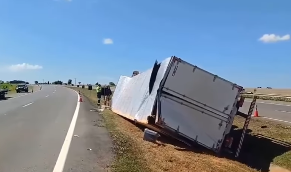 Um caminhão carregado com cigarros contrabandeados do Paraguai tombou na BR-050, na altura do km 200, entre Catalão e Campo Alegre, no sudeste de Goiás, por volta das 7h deste domingo (16).